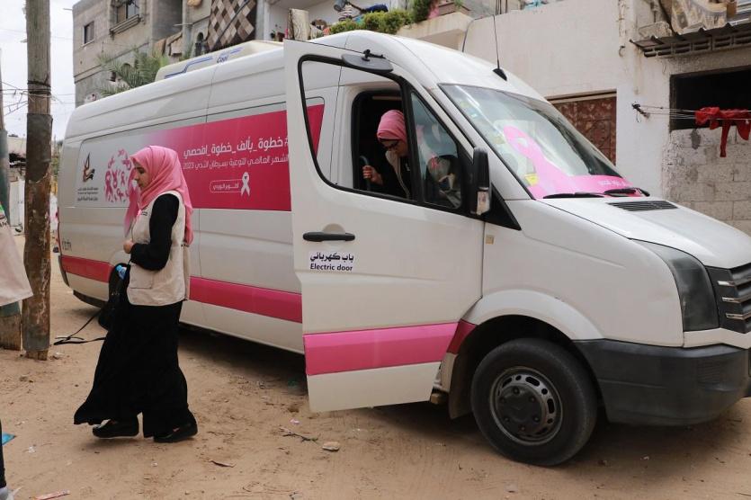 وبدورها قالت مدير مركز صحة المرأة فريال ثابت: "سيتبع الباص التوعية قافلة وردية لإجراء الفحص للنساء بكل محافظات قطاع غزة ".