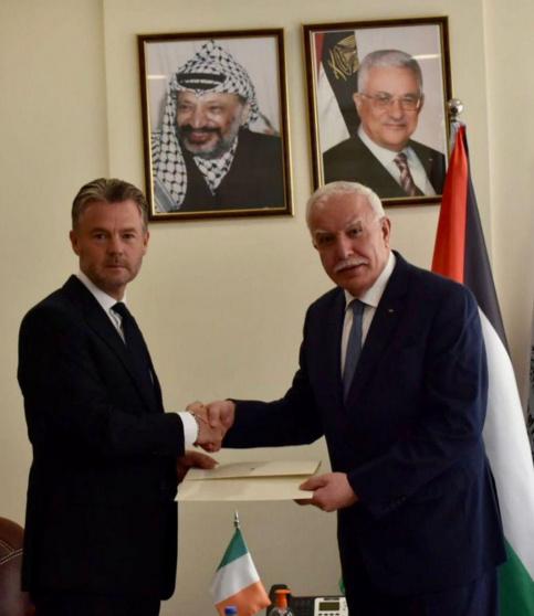 تسلم وزير الخارجية والمغتربين د. رياض المالكي صباح اليوم الثلاثاء في مقر الوزارة، نسخة من أوراق اعتماد ممثل جمهورية إيرلندا الجديد المعتمد لدى دولة فلسطين السيد فيليم ماكلوفلين.
