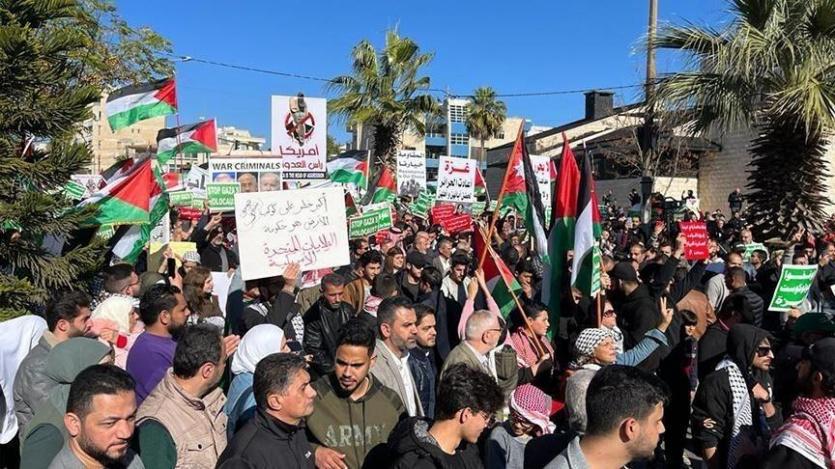 خرج آلاف الأردنيين في مسيرات ووقفات بالعاصمة الأردنية عمان ومختلف محافظات المملكة، بعد صلاة الجمعة، تضامنا ودعما لفلسطين، وتنديدا بالعدوان الإسرائيلي المستمر على قطاع غزة لليوم الـ119.