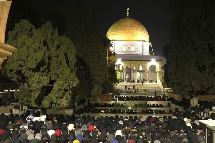 أدى عشرات آلاف المواطنين صلاتي العشاء والتراويح، في رحاب المسجد الأقصى المبارك، رغم قيود وتضييقات الاحتلال الإسرائيلي.