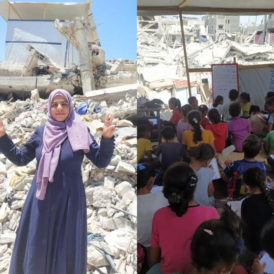 تواجه المعلّمة إسراء أبو مصطفى ويلات الحرب والدمار الذي حلّ بقطاع غزة بكافة قطاعاته وخاصة التعليمية، صامدة أمام الحرب، مثبتة أقدامها فوق الركام لتبني مكانًا تعليميًا يجابه الأمية التي يريدها الاحتلال لأطفال غزة.