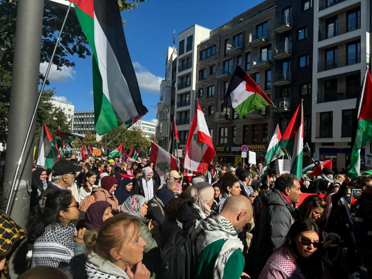 ورفع المشاركون في المسيرة التي سارت في شوارع مدينة هامبورغ، العلمين الفلسطيني واللبناني، واللافتات التي تُعبر عن التضامن مع الشعبين الفلسطيني واللبناني، وتُندد بالجرائم التي يرتكبها جيش الاحتلال بحق المدنيين الفلسطينيين في قطاع غزة والضفة ولبنان.
