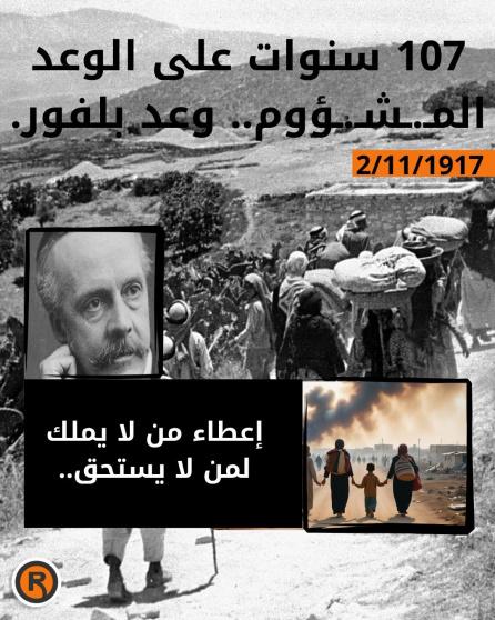 تصادف اليوم ٢ من نوفمبر العام ١٩١٧، ذكرى مرور 107عاماً على وعد بلفور المشؤوم، الذي أعطى الحق لليهود بالأرض ليزور بذلك التاريخ والجغرافية والرواية الأصلية التي تؤكد أن الفلسطينيون أصحاب هذه الأرض منذ الآلاف السنين منذ الكنعانيين.