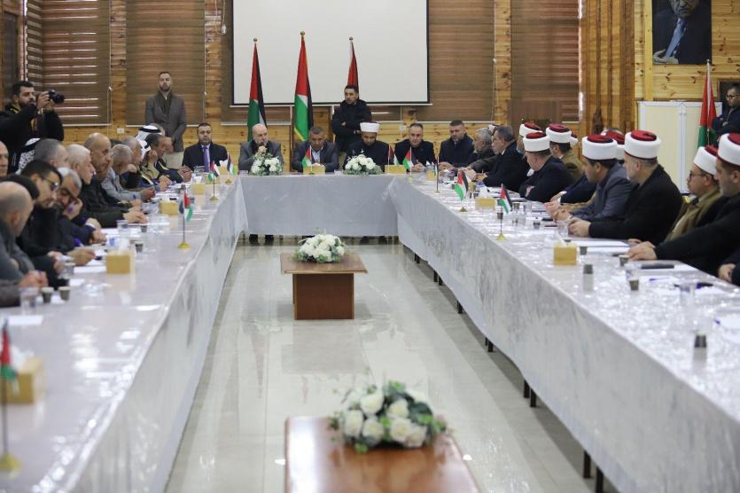 اجتمع قاضي قضاة فلسطين، مستشار الرئيس للشؤون الدينية والعلاقات الإسلامية، محمود الهباش، ووزير الأوقاف والشؤون الدينية محمد مصطفى نجم، بحضور محافظ الخليل اللواء خالد دودين، اليوم الاثنين، مع وجهاء وعشائر وشخصيات رسمية وأهلية من المحافظة.