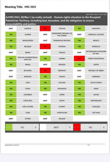صادق مجلس حقوق الإنسان التابع للأمم المتحدة، في جلسته الثامنة والخمسين، على قرار بشأن حالة حقوق الإنسان في الأرض الفلسطينية المحتلة، بما فيها القدس الشرقية، والالتزام بضمان المسائلة والعدالة. وحظي القرار بتأييد 27 دولة، مقابل 4 دول معارضة، فيما امتنعت 16 دولة عن التصويت.