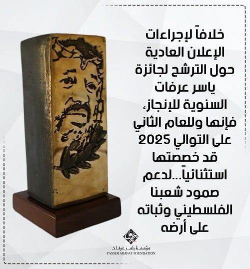 وأكدت أن هذا الإجراء الاستثنائي لجائزة ياسر عرفات للإنجاز للعام 2025 استجابة لصرخات أطفالنا واستغاثات نسائنا وشيوخنا التي تحكي للعالم ودعاة حقوق الانسان قصة الشعب المظلوم، وتقديرا لمستحقي هذه الجائزة ممن لبّوا نداء أنين أطفال جرحى أو أمهات ثكلى أو فضحوا جرائم المحتل أو ناصروا عدالة قضيتنا وحقوق شعبنا في الحرية والاستقلال، وإقامة دولته ذات السيادة الوطنية الكاملة ليعيش حرا كريما كباقي شعوب المعمورة.