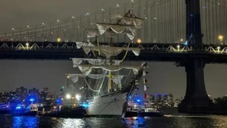 اصطدام سفينة حربية ضخمة تابعة للبحرية المكسيكية بجسر بروكلين