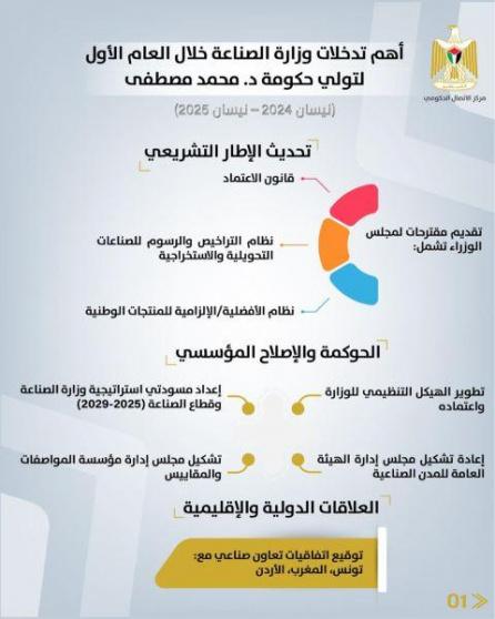 أصدر مركز الاتصال الحكومي تقريرا يبيّن أهم تدخلات وزارة الصناعة خلال العام الأول لتولي حكومة محمد مصطفى (نيسان 2024 – نيسان 2025) والتي تضمنّت عرضا لجهود الوزارة في مجالات تنمية القطاع الصناعي، ودعم المنتج الوطني، والإصلاحات التشريعية والمؤسسية، والتعاون الدولي، ودعم القطاع الخاص، وتعزيز البنية التحتية الصناعية.