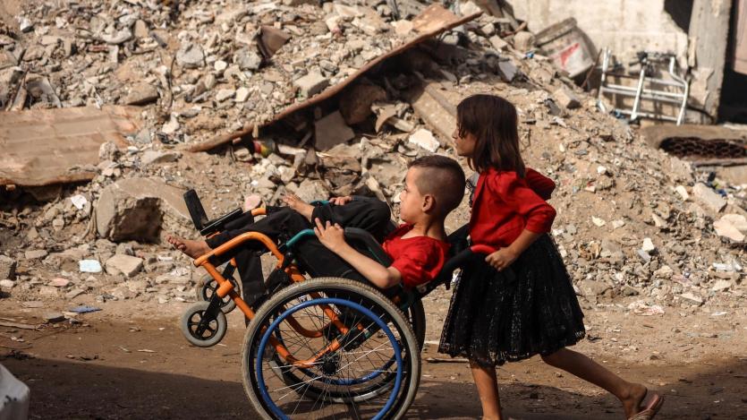 طفلة فلسطينية تدفع بعزمٍ أخاها المعاق على كرسيه المتحرك وسط ركام المنازل في مدينة غزة، 1 يوليو 2025.