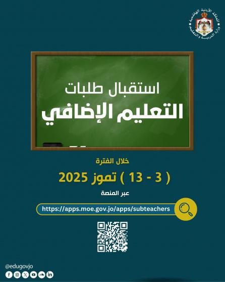 أعلنت وزارة التربية والتعليم في الأردن عن فتح باب التقديم للعمل على حساب التعليم الإضافي اعتبارًا من يوم الخميس 3 يوليو/تموز 2025، وذلك من خلال الرابط الإلكتروني الرسمي.