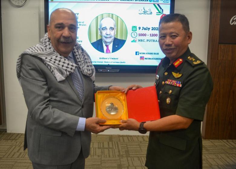 ألقى سفير دولة فلسطين لدى ماليزيا وليد أبو علي يوم الاربعاء الموافق 9-7-2025م محاضرة بعنوان "الصراع الفلسطيني الإسرائيلي - الآفاق المستقبلية للسلام" تلبيةً لدعوة كريمة من الكلية الوطنية للصمود التابعة للقوات المسلحة الماليزية بحضور ادارة الكلية واعضاء الهيئة التدريسية ومجموعة من الضباط الماليزيين وعدد من الطلبة الدوليين من قطر، بنغلاديش، الأردن، تايلاند، بروناي، وإندونيسيا.