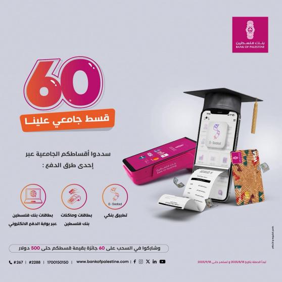مع بداية كل عام أكاديمي، يعيش آلاف الطلبة الفلسطينيين وأسرهم حالة من الترقب والقلق، إذ يتزامن موسم التسجيل في الجامعات مع تحديات اقتصادية متفاقمة، لا سيما الأقساط الجامعية التي باتت تمثل عبئاً ثقيلاً على الكثير من العائلات، وفي ظل محدودية الموارد والدخل، يجد العديد من الطلبة أنفسهم أمام خيارات صعبة، قد تؤثر على مسيرتهم التعليمية ومستقبلهم المهني، وفي خطوة استراتيجية تهدف إلى تخفيف هذه الأعباء، أعلن بنك فلسطين عن إطلاق حملة وطنية تحت شعار "60 قسط جامعي علينا"، تستهدف طلبة الجامعات الفلسطينية وتقدم لهم فرص للفوز عبر تسديد أقساطهم الجامعية من خلال بطاقات بنك فلسطين باستخدام الوسائل الإلكترونية الحديثة من مكانهم دون الحاجة لزيارة فروع البنوك.