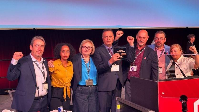 وتسلّم الجائزة نقيب الصحفيين الفلسطينيين ناصر أبو بكر، خلال المؤتمر الدستوري لـ"يونيڤور" في فانكوفر.
