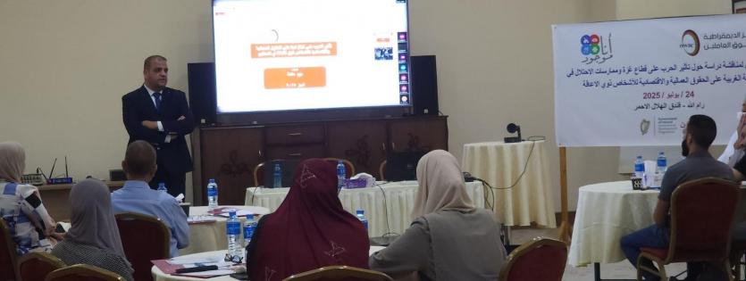 جاء ذلك خلال ورشة العمل التي نفذها مركز الديمقراطية وحقوق العاملين حول نتائج مسح ميداني لدراسة تتعلق بتأثير حرب الإبادة على قطاع غزة وممارسات قوات الاحتلال وقطعان مستوطنيه واعتداءاتهم وتدابير فرضهم العقاب الجماعي وعملياتهم العسكرية الانتقامية والعنيفة في الضفة الغربية، على الحقوق العمالية والإقتصادية للأشخاص ذوي الإعاقة في فلسطين بمشاركة الباحث الإقتصادي مؤيد عفانه وبحضور ممثلين عن وزارة العمل ومؤسسات وجمعيات ونقابات تمثلت في الإتحاد العام للاشخاص ذوي الإعاقة ومؤسسة قادر للتنمية المجتمعية ونقابة العاملين في الخدمات البريدية ونقابة العاملين في الخدمات الادارية وبلدية رام الله وجمعية بنات الريف الخيرية ومركز جبل النجمة للتأهيل وجمعية الياسمين الخيرية وتجمع المدافعين عن حقوق الإنسان ومؤسسة (انيبل) و(اديوكيد).
