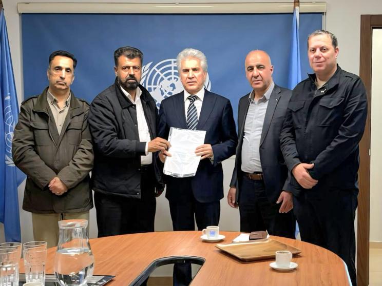 سُلّمت، اليوم، نسخة من رسالة عاجلة بشأن أوضاع الأسرى الفلسطينيين، موقّعة من قبل 50 هيئة ومئات الشخصيات من 22 دولة، إلى المستشار السياسي للأمم المتحدة في فلسطين، د. باسم الخالدي، وذلك في إطار الجهود الدولية المتواصلة للضغط من أجل حمايتهم ووقف الانتهاكات بحقهم، وفي مقدمتها ما يُعرف بـ"قانون إعدام الأسرى".