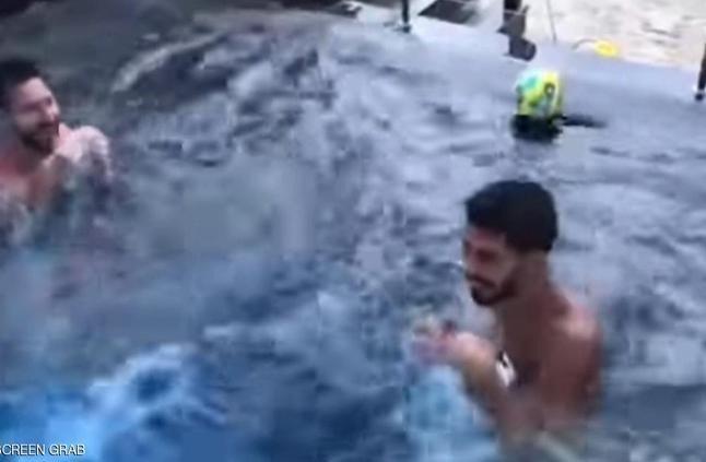 استعرض النجم الأرجنتيني ليونيل ميسي، وزميله في نادي برشلونة، الأوروغوياني لويس سواريز، مهارتهما في حوض سباحة بإحدى جزر الكاريبي.