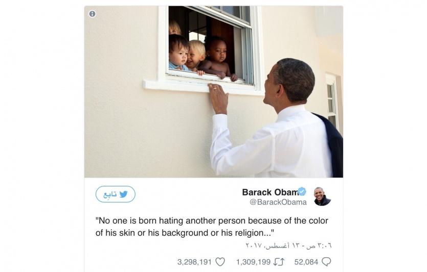 واقتبس أوباما في تلك التغريدة، التي كانت الأولى ضمن سلسلة من ثلاث تغريدات، جملة للزعيم الجنوب أفريقي الراحل نيلسون مانديلا مرفقة بصورة لأوباما وهو يبتسم لمجموعة من الأطفال ينتمون لعرقيات مختلفة.
