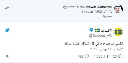 تغريدة العصيمي دفعت الحساب الرسمي لدولة السويد بالعربية على "تويتر" لنفي المعلومة، ليرد الشاب بطلب إثبات، ومن ثم يأتيه الرد بأن الكاميرات في الأماكن العامة ويمكن لأي شخص أن يراها.