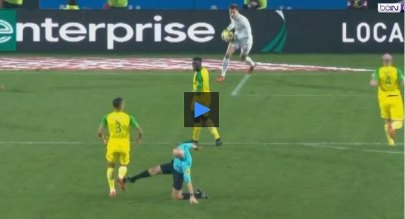 ففي الوقت الذي كانت تتجه في مباراة نانت وباريس سان جيرمان في الدوري الفرنسي إلى نهايتها على وقع هجمة للباريسي اشترك المدافع البرازيلي لنانت دييغو كارلوس مع الحكم الذي تعثر فما كان منه إلى أن استدار حانقاً وركل اللاعب على ساقه.
