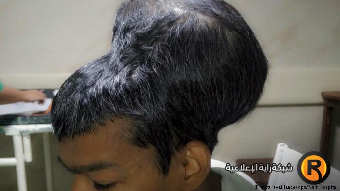 وكان المريض يعاني من ورم في رأسه تضخم في السنوات الأخيرة ليصبح حجمه بحجم رأس إضافي، وذكر الأطباء ان المريض كان يعاني من ثقل وصداع وضعف في الرؤية وهو عمرة سنة وحدة.