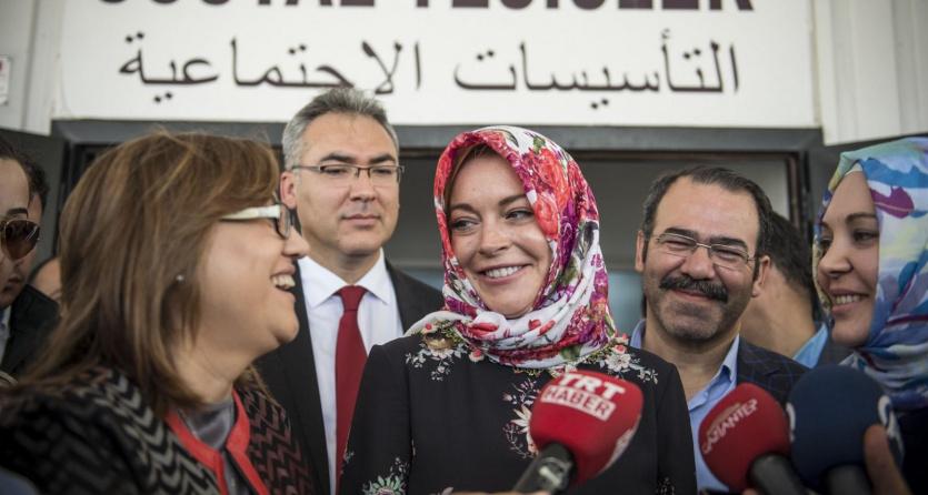 الممثلة الأميركية لوهان ترتدي الحجاب للموضة المحتشمة