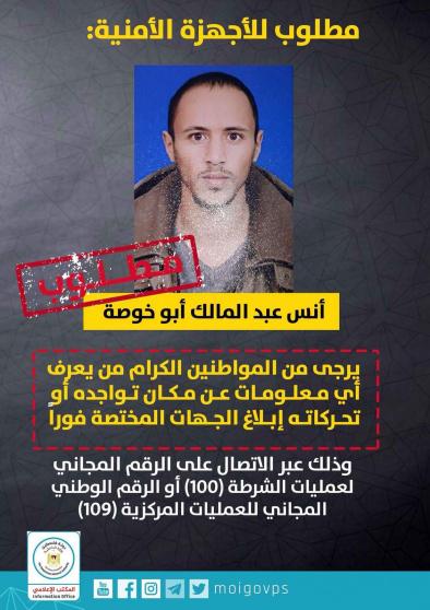 وقالت الوزارة في تصريح صحفي نشرته على موقعها الرسمي، إن المدعو أنس عبد المالك أبو خوصة مطلوباً للأجهزة الأمنية.