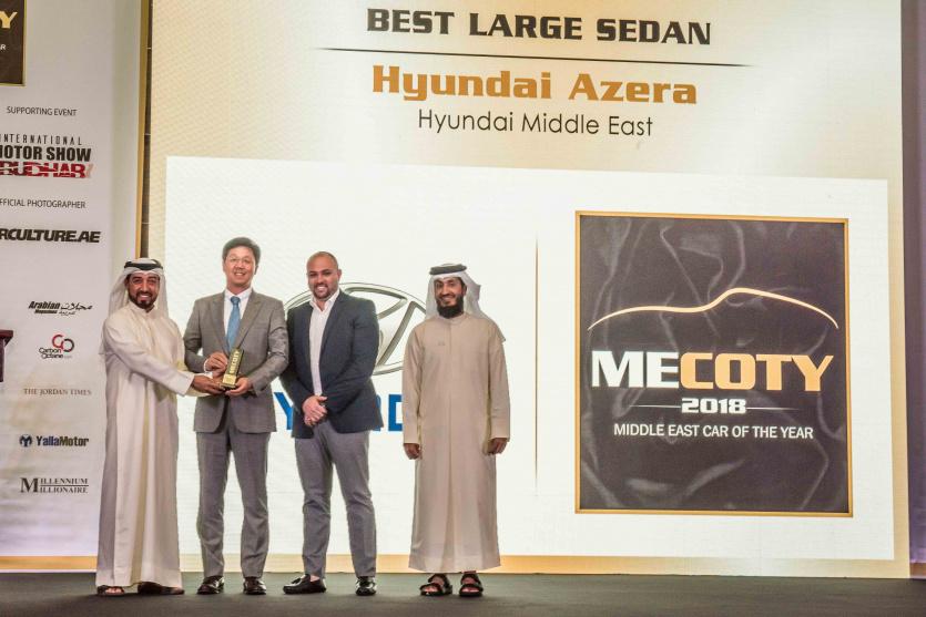 وتفوّقت أزيرا على منافستها "أوبل إنسيحنيا" المتأهلة معها إلى نهائي فئة سيارات الصالون الكبيرة، فيما كانت سيارة هيونداي سوناتا تأهلت إلى نهائي فئة سيارات السيدان المتوسطة الحجم. وجرى توزيع جوائز الشرق الأوسط للسيارات خلال حفل أقيم في مركز أبوظبي الوطني للمعارض في 2 أبريل 2018.
