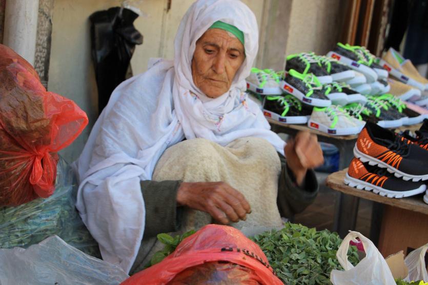 الحاجة السبعينية مليحة الطروة التي رسم الزمان في وجهها خطوط الشقاء٬ تجلس هناك مستندة الى جدار احد المحال التجارية تقطف أوراق الزعتر وتعرضه للبيع.