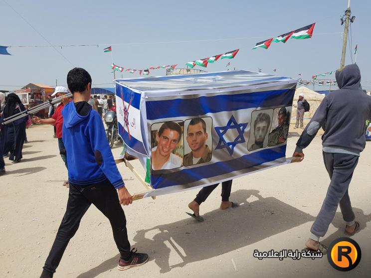 رفع مجموعة من الشبان الفلسطينيين المشاركين في فعاليات الجمعة الثالثة من مسيرة العودة الكبرى شرق مدينة غزة، "تابوتاً" علقوا عليه صورا لجنود الاحتلال الإسرائيلي المحتجزين لدى المقاومة في قطاع غزة.
