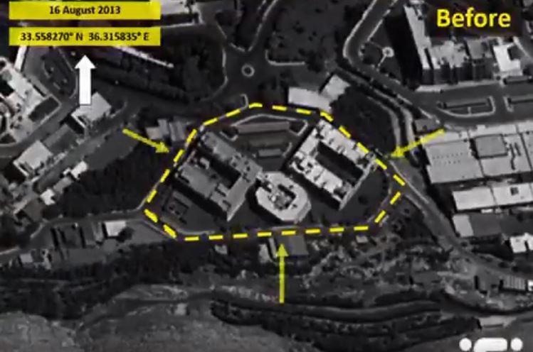 وأظهرت التسجيل الذي نشره موقع Image Sate International على حسابه في تويتر الأضرار التي لحقت بمركز "جمرايا" السوري للأبحاث العلمية، المخصص لبرنامج الأسلحة الكيماوية.