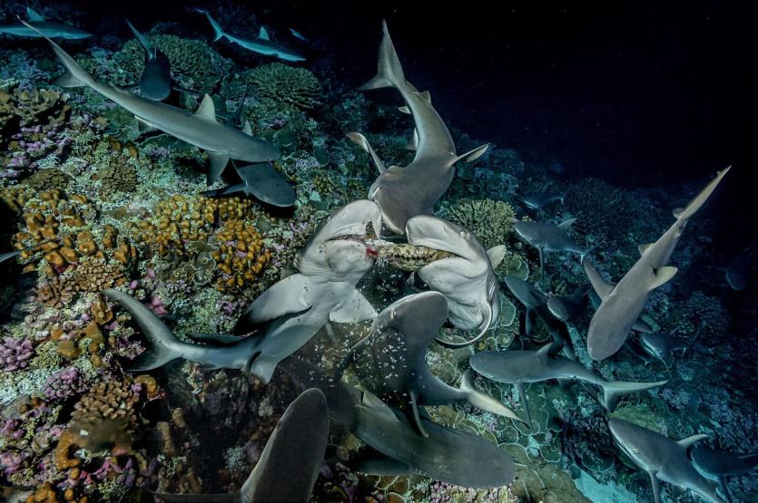 .. وتحقيق آخر عن الصراع الذي تدور أحداثه في مياه جزيرة "فاكارافا" الفرنسية خلال شهر يونيو من كل عام، بين أسماك قرش هائجة جائعة وأسماك قُشر وفيرة متناسلة؛ في مشهدٍ يموج بالدماء والأشلاء.. والمفاجآت. ومن ذلك أن أسماك القرش تنتظم في شكل مجموعات -مثل قطعان الذئاب- وهي تهاجم أسماك القُشر؛ فيما ذكور هذه الأخيرة تتقاتل فيما بينها بوحشية على مرّ أربعة أسابيع من أجل لحظة تزاوج تدوم ثانية واحدة.. فقط.