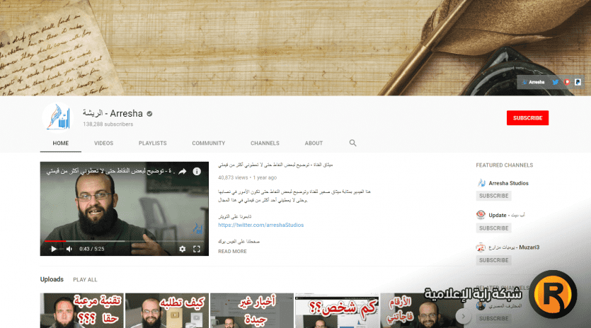 يتضمن موقع اليوتيوب عدة قنوات عربية وعالمية منها قناة الريشة التي تركز في محتواها على الجانب التعليمي التقني.
