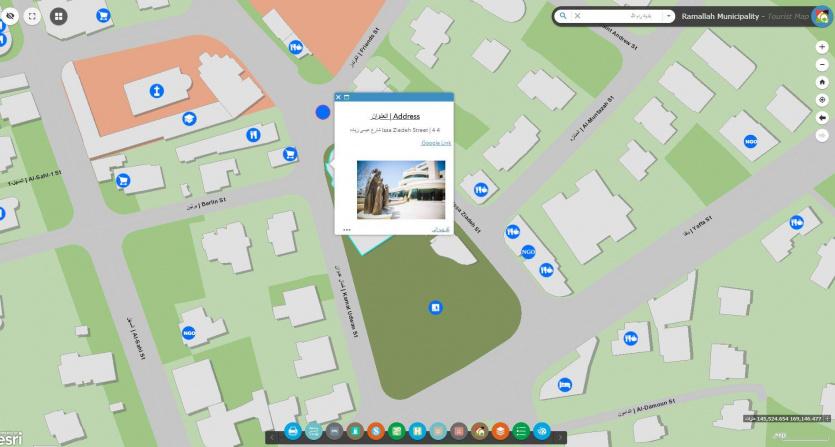7. ربط تصوير شركة جوجل العالمية لمدينة رام الله" بخاصية الستريت فيو "Google Street View" على جميع التطبيقات المكانية التفاعلية لبلدية رام الله، مما يمكن المواطنين وموظفي البلدية من التجول افتراضيا إفتراضيا حول اي عنوان كما لو كان يتجول حقيقة في ذلك المكان من خلال صوراً بانورامية يمكن رؤيتها من جميع الإتجاهات. ويمكن مباشرة التجول الافتراضي من خلال الرابط https://goo.gl/WqLnZ6