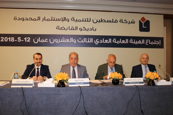عقدت، أمس السبت، شركة فلسطين للتنمية والاستثمار المحدود (باديكو القابضة) اجتماع هيئتها العامة العادي الثالث والعشرين في مدينة عمّان، حيث ترأسه منيب رشيد المصري رئيس مجلس الإدارة، فيما تم نقل وقائع الاجتماع مباشرة مع فندق الكرمل في مدينة رام الله بالصوت والصورة من خلال نظام الاجتماعات المرئي.