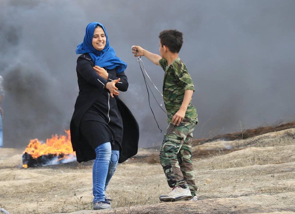 صورة للشهيدة الشيخ خليل، أظهرت اللحظات الأخيرة من حياة الطفلة، حيث كانت تلهو مع أحد الأطفال وسط الدخان والنار على الحدود الشرقية لمخيم البريج، قبل أن ينزعج قناص إسرائيلي من مشهد اللهو هذا، ويرديها.