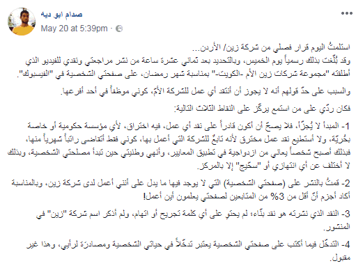 ابو ديه اوضح بان قرار فصله من الشركة جاء بعد محاولات حثيثة من قبل ادارة شركة"زين" لاقناعه بحذف النقد الذي نشره عبر صفحته عن الاعلان كونه احد موظفيها ولا يسمح له بانتقاد الشركة الامر الذي رفضه ابو ديه مشيرا الى ان ما نشره هو نقد بناء ولم يحمل اي اهانه للشركة كما انه لم يذكر في منشوره اسم "زين" او انه يعمل لديها.