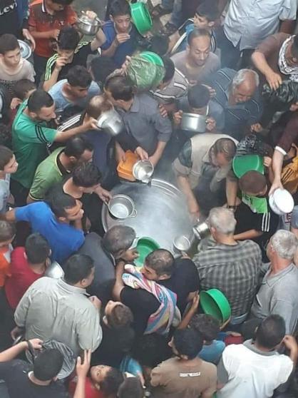 تداول رواد مواقع التواصل الاجتماعي صورة من حي الشجاعية شرق مدينة غزة، لعشرات المواطنين وقت الإفطار وهم يحملون أطباقهم ويتهاتفون للحصول على حصتهم من الطعام.