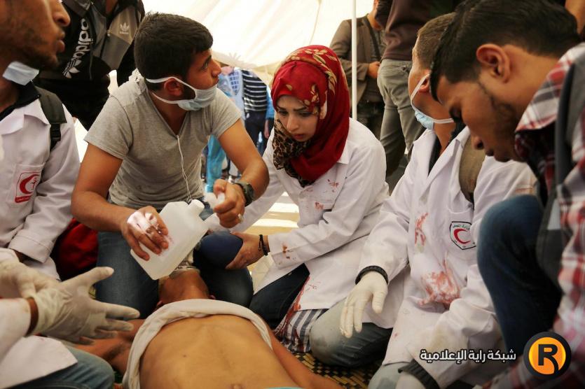 المسعفة رزان النجار تقدم الاسعافات الاولية لاحد الجرحى