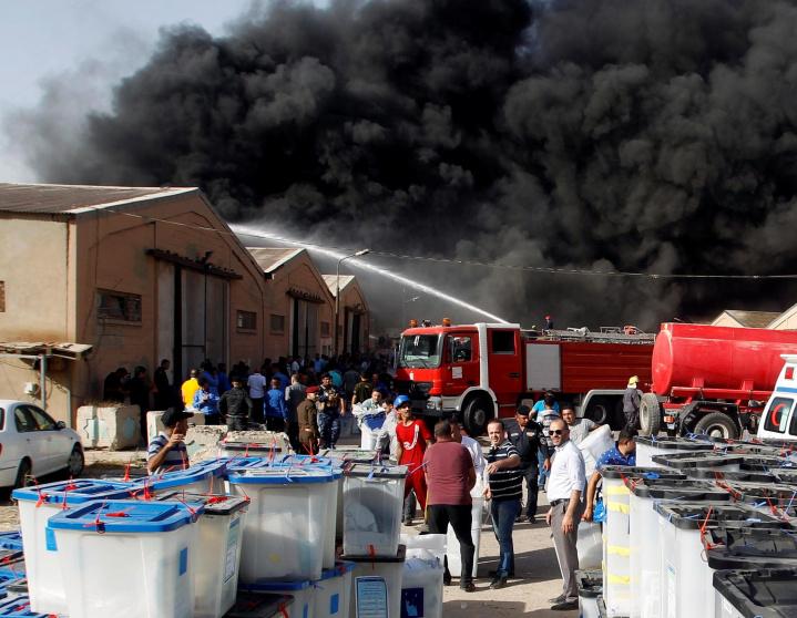 وقالت وزارة الداخلية إن الحريق التهم المخزن الضخم التابع لمفوضية الانتخابات قرب منطقة الرصافة، مؤكدة أن الصناديق احترقت بالكامل.