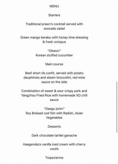 وبحسب موقع "مزمز" السعودي، شملت طاولة غداء العمل بين ترامب وكيم، ووفديهما سلطة جمبري تقليدية مع الأفوكادو، كما تضمنت أيضًا أضلاع لحم العجل مع البطاطس والبروكلي وصلصة النبيذ الأحمر، ولحم الخنزير الحلو مع الأرز وصلصة الفلفل الحار، وسمك القدّ المطهو على نار هادئة مع الخضروات، أما التحلية فكانت الشيكولاتة والبوظة.