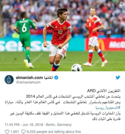 وفقاً للتقارير الصحفية الألمانية فإن المنتخب الروسي تناول المنشطات في كأس العالم 2014، وتحاول المخابرات الروسية التدخل لتغطي هذا التحايل.