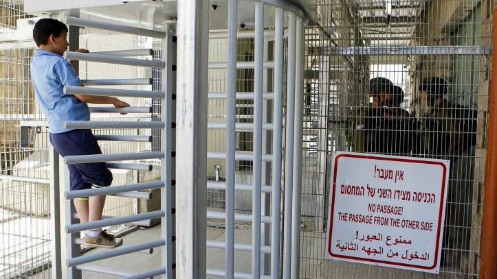 طفل يحاول المرور عبر حاجز عسكري اسرائيلي في حي تل الرميدة