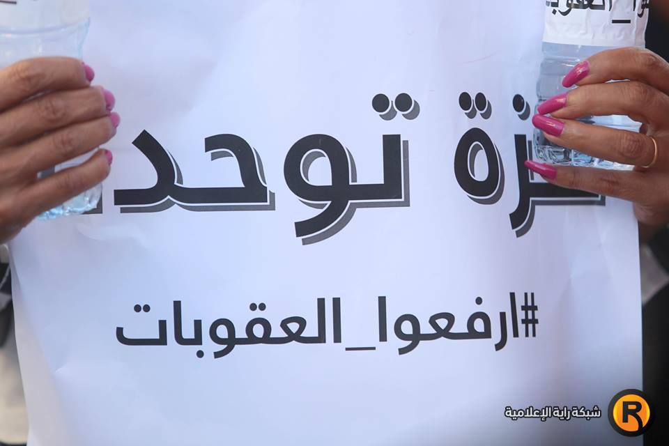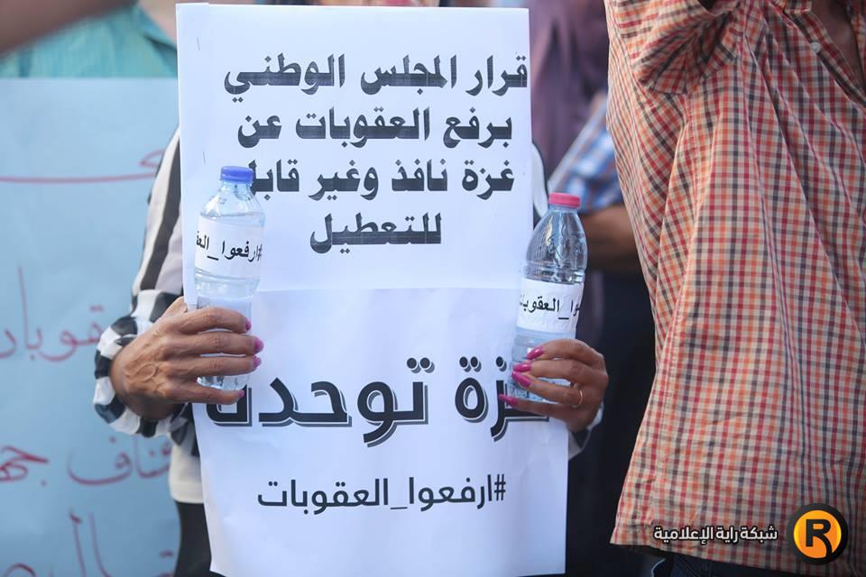 ورفع المشاركون لافتات تطالب برفع الإجراءات وانهاء الانقسام، كما وجهوا نداءات للرئيس محمود عباس ورئيس الحكومة رامي الحمد الله وأعضاء اللجنة التنفيذية لمنظمة التحرير بضرورة رفع العقوبات عن القطاع.