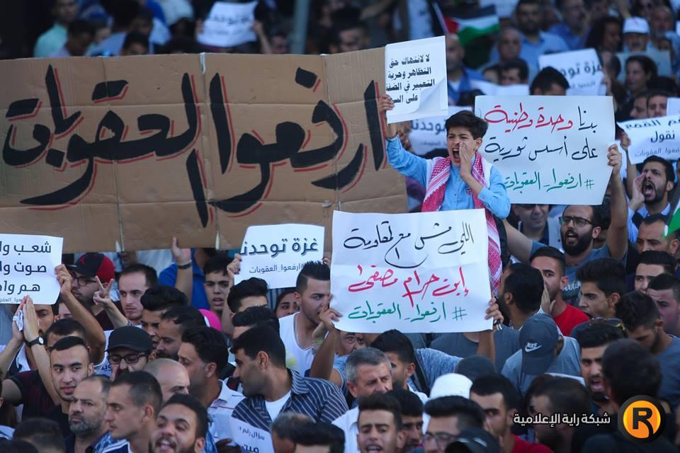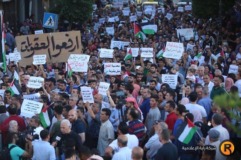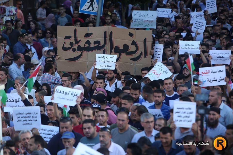 خرج مئات المواطنين في تظاهرة عند دوار المنارة وسط مدينة رام الله، مساء السبت، للمطالبة برفع الإجراءات التي تفرضها السلطة الفلسطينية على قطاع غزة.