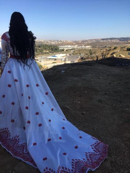 الأسيرة المحررة صمود كراجة من قرية صفا،تقف مرتدية فستان عرسها على تلة مطلة على سجن عوفر غرب رام الله حيث يقبع خطيبها الأسير جميل عنكوش الذي يقضي حكمًا بالسجن 20 سنة.