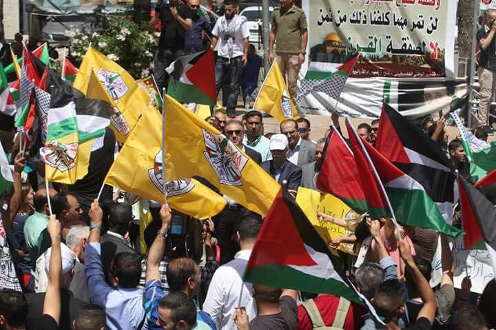 وقال نائب رئيس حركة فتح محمود العالول في كلمةٍ ألقاها في المسيرة إن الشعب الفلسطينيين لا يريد المساعدات بريد الدولة والوحدة ضد صفقة القرن.