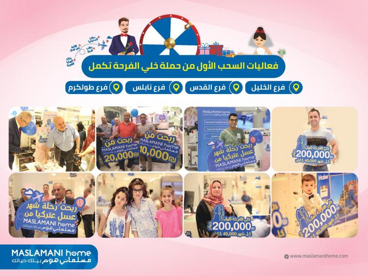 أعلنت شركة مسلماني هوم عن أسماء الفائزين بالسحب الأول ضِمن حملة "خلي الفرحة تكمل"، وشملت الجوائز 40000 شيكل كاش ورحلتين شهر عسل إلى تركيا وإقامتين في أفخم فنادق فلسطين، وُزعت على سبعة فائزين في معارض مسلماني هوم، حيث فاز بـ 20,000 شيكل كاش فراس محمود سفاريني، وبـ 10,000 شيكل كاش خلدون أحمد عجولي، وبـ 10,000 شيكل كاش أحمد سمير السرغلي من طولكرم، وفاز برحلتي شهر عسل إلى تركيا كل من أسامة أحمد صلاحات من نابلس، ومحمد إسماعيل خلاف من الخليل، وفاز في إقامتين في فندق كل من أحمد بسام جوابرة وأسامة أحمد صلاحات من نابلس.