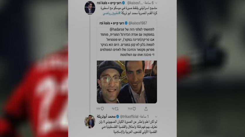 وكتب الصحفي إن: "مشجع اسرائيلي يلتقط صورة في موسكو مع اسطورة كرة القدم المصرية محمد ابو تريكة #تطبيع_رياضي".