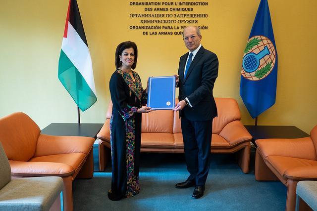 ونقلت السفيرة سليمان خلال المراسم الرسمية لتقديم أوراق الاعتماد تحيات الرئيس محمود عباس الى المدير العام للمنظمة، والذي رحب بدوره بانضمام فلسطين لاتفاقية الأسلحة الكيميائية، مشيرا الى ان انضمام فلسطين يعزز دور المنظمة وأهدافها في منع إنتشار وإستخدام وتخزين الأسلحة الكيميائية.