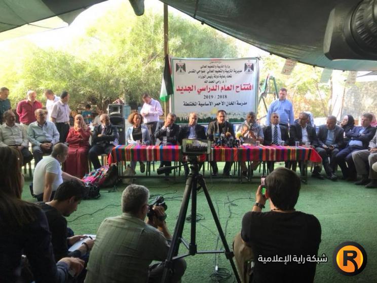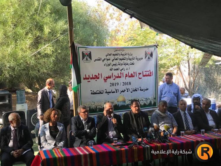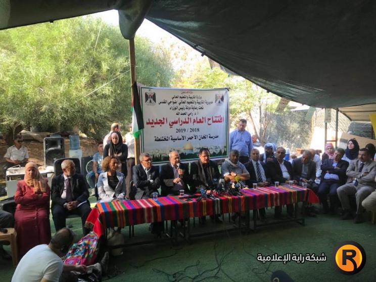 افتتح وزير التربية والتعليم العالي صبري صيدم العام الدراسي في مدرسة قرية الخان الأحمر المهددة بالهدم استثنائياً.